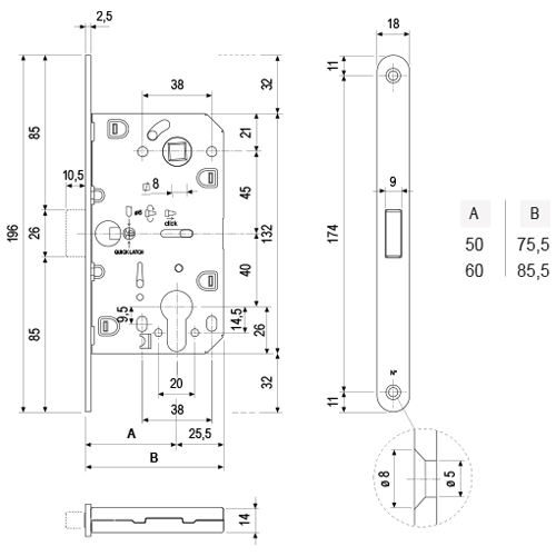 Contiene un cerradero minimalista y regulable a +/- 1mm. Combina un mecanismo fluido y silencioso permitiendo una alta funcionalidad de la cerradura.